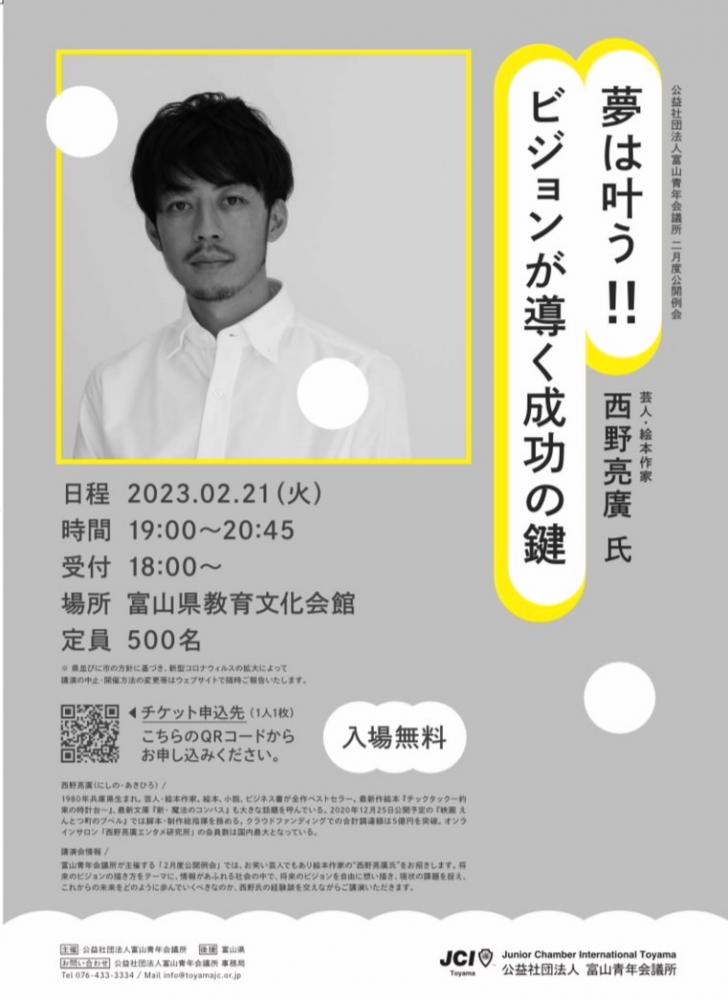 公開例会を3回開催させていただきます。そして記念すべき第1回目の公開例会では、講師に、芸人・絵本作家である、キングコングの西野さんをお招きし「理想のビジョンを想い描く大切さ」について、熱く講演いただきます。また、2月度公開例会は、JCI富山の活動発信を一般市民に伝える大切な1発目であり、より多くの一般参加者を募りたいと同時に、会員全員がこの場所に集い、1年間の運動・活動における最高のキックオフになればと考えております。そこで我々は、JCI富山が2015年以降、成し遂げることが出来なかった、100%例会を達成したいと計画しています。最高の舞台を創りだす為にも、会員一人ひとりの参画意識が大切であり、誰ひとり欠けることなく、この会場に集結したいと考えておりますので、どうか皆さまのお力を貸してください。よろしくお願いします!!