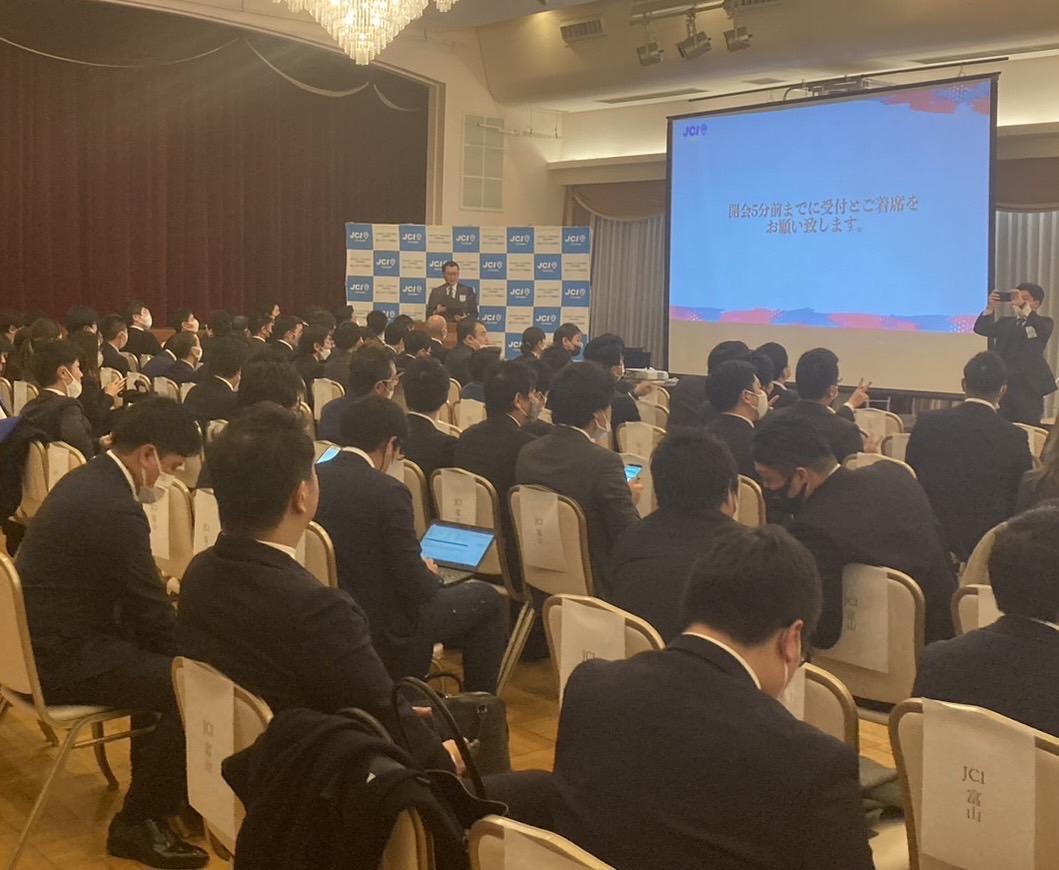 今回の会場は、1952年「富山懸青年会議所」が発足された場所である富山電気ビルディングで、大ホールいっぱいに椅子が並べられ、300名以上の方々が集まりました。新田八朗知事をはじめ、富山県内プロスポーツ球団代表などのご来賓の方々をお迎えし、「北陸信越地区 富山ブロック協議会 第1回全体会議」の進行は開始されました。冒頭のオープニングムービーにて、1952年に発足した「富山懸青年会議所」の当時から現代にいたるまでの写真、富山県内9LOMの紹介を兼ねた写真動画が映し出されました。富山ブロック協議会の歴史の深さと、多くの先輩方の努力と支えによって今の自分があることを感じ、改めて、先輩方への尊敬の念と、仲間たちへの感謝の気持ちが溢れました。