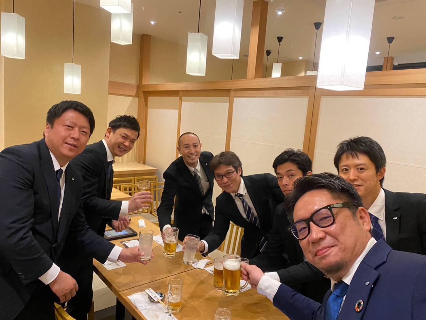最初は、みなさん、徐行運転の雰囲気でしたが徐々に雰囲気柔らかくなったところに新田理事長、奥村専務がお祝いに駆けつけてくれました。新田理事長にもご挨拶いただき、日本酒もいただきました。まぁ、しかし、この日本酒が1次会で空になるとは思いませんでした・・・理事長、美味しくいただきました!!ありがとうございます。