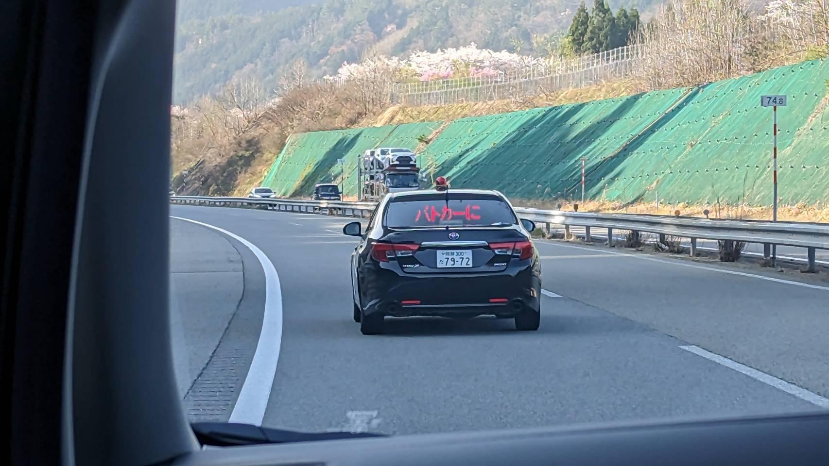言っている人がいます。車の上には赤いパトライトが...そうです黒色のマークXに乗った青い人。