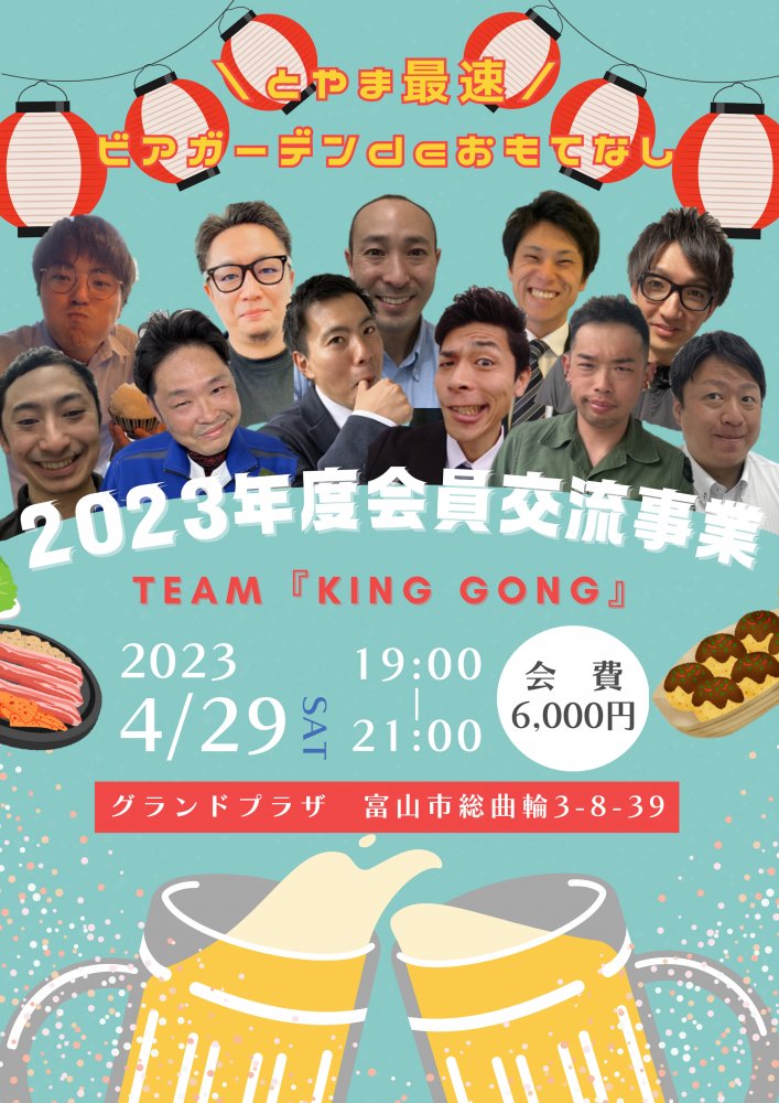 皆さまこんにちは!会員交流事業 副実行委員長のレゲエです。今月末、皆さまお待ちかね、私たちTEAM『KING GONG』による~とやま最速 ビアガーデンdeおもてなし~を開催いたします!!!今回私たちが企画する事業では、皆さまに楽しんでいただくための仕掛けをいくつも用意しております。