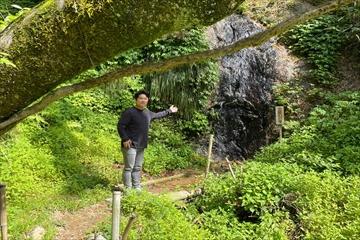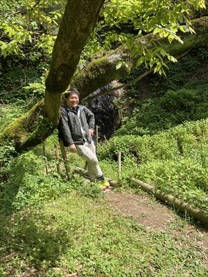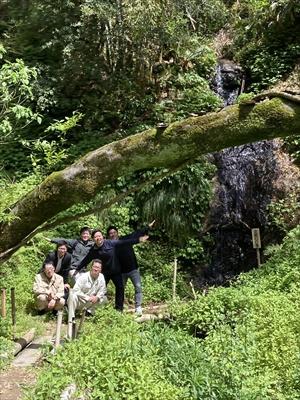 滝で記念撮影をし、これで帰れるのかなと思っているとさらに山道を進みます。細い道をさらに右に左に上下するうちに神社につきました。なんと某陰謀論の会でも来たことがあるそうです。ボランティアの方がきれいにしてくださっているという説明を受けると、すかさずミヤモンさんが「きれいな方がきれいにしてくださっているのですね。」と、さすが日頃からきれいな女性に囲まれている人は違います。本日一番の学びだったと思います。自分が樹木の説明をすると造園屋みたいだねと、珍しく曲がってるねよりコメントをもらいました。そうこう楽しく散策しているうちに2時間程度の散策が終わりました。