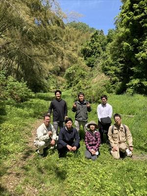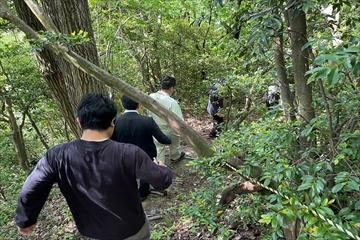 今井様からの簡単な説明の後、フットパスの散策です。低い山だし楽勝と思っていましたが、最近現場に出てないことが祟ったのか結構きつい。山道は険しくぬかるみもあり、高低差も結構あります。目的地の幻の滝まで着くころには息が上がっていました。たまには外で体を動かさないとダメですね。他の人はどうだろうと見渡すと滝のように汗の流れるティッシュ、こんなところにも幻の滝がありました。自分は覚えがないのですが2018年にこの場所で事業を行ったらしく、そのころと景色が変わっているとなんとも時の流れが感じられるコメントがあったりしました。