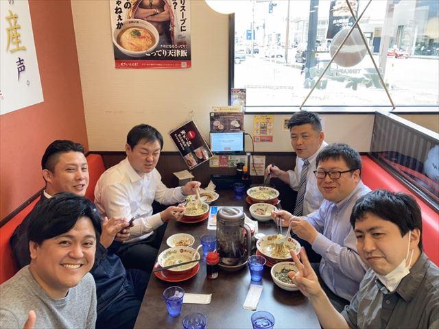 もう食べ終わりかという時。店員さんが「お待たせいたしました!」と、冷やし中華を4杯持ってこられました。密かに第2ラウンドのゴングが鳴らされていたのです。皆さん「俺はまだ食えるのか・・・?」みたいな厳しい顔をされていましたが、結構これが美味しく、すぐなくなりました。その後も私のテーブルでは煮卵争奪(?)のジャンケンが勃発したりと激しい闘いが繰り広げられましたが、何とかお残し・脱落者なく無事例会を終えることができました。