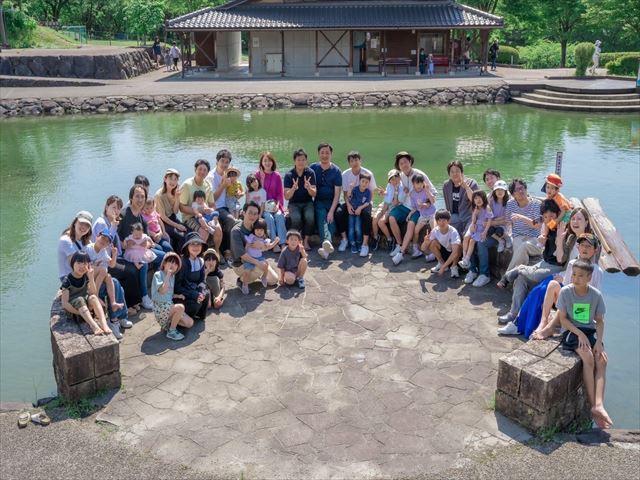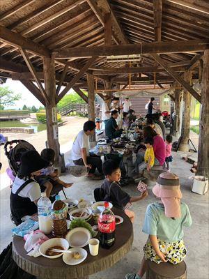 待ちに待った当日、私の家族は途中からの参加でしたが、メンバーと家族で約40名参加していただき、子どもたちが元気に楽しく遊ぶ姿、そしてたくさんの笑顔と笑い声がバーベキュー場に溢れていました。私の娘たちは、バーベキュー場前の池(衛生面で不安があるが、水深は浅そう)の上をイカダに乗って遊んだことが、とても楽しかったと喜んでいました。