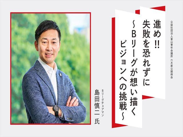 6月度公開例会では、日本のプロバスケットボールBリーグのチェアマンであり、バスケットボール界の重鎮、島田慎二氏をお招きしています。テーマは「進め!!失敗を恐れずに~Bリーグが想い描くビジョンへの挑戦~」です。