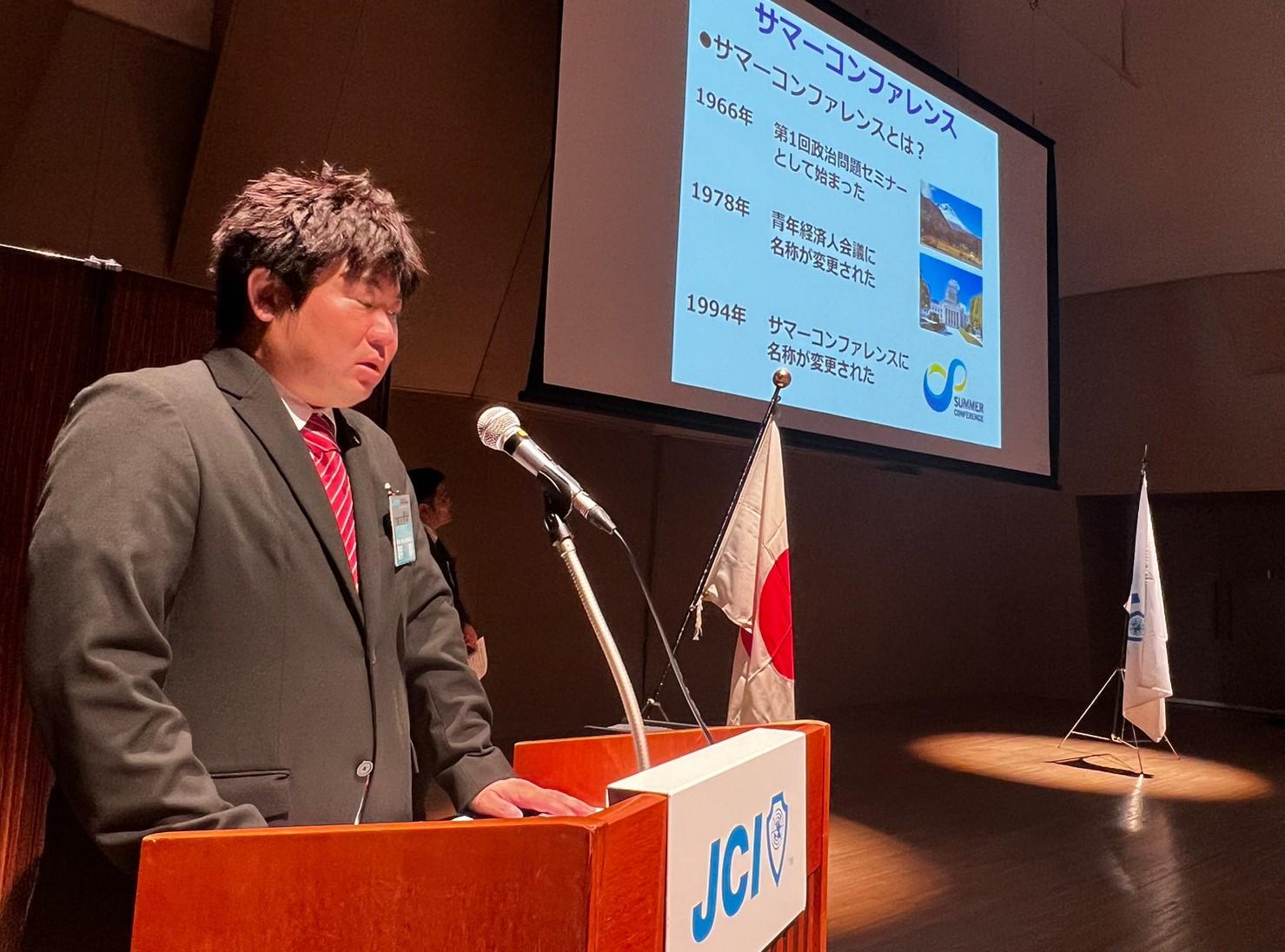 皆さま、お疲れさまです。アカデミー委員会副委員長の土肥亮二です。7月18日(金)に開催されました7月度例会にてJCI日本 全国大会運営会議 議長の佐藤昂紀君に3大大会(京都会議、サマーコンファレンス、全国大会)についてご講演いただきました。1989年生まれ現在33歳で、入会した年から全国大会運営会議の委員として出向し、6年間のうち5年間日本出向を経験され、その多くの出向の経験から3大大会の意義や目的についてご講演いただきました。