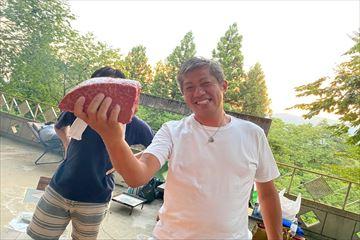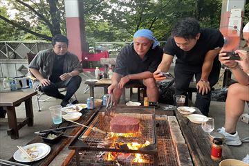 夕方から開始でしたが、この日も35度を超える気温の中キャプテン、スタッフで設営、準備をして汗だくになりながら炭を起こし、熱中症なども懸念されましたが、徐々に参加者が集まってお酒を飲み始めると暑さも忘れていきました。大自然の中で飲むビールやワインは最高で仕事やJC活動の忙しさを忘れられるひとときでした。普段難しい顔をしている松原キャプテンの顔も仏のようにリラックスして見えました。肝心のBBQでは巨大な肉のかたまりをじっくり焼き上げたのが最高でした。一切野菜がなかったので次回はヘルシーなものを差し入れたいと思います。