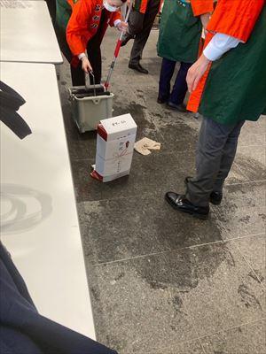 とのLINEのメッセージが!えー!!どういうこと!?みたいな感じで、そのあとはあまり話も耳に入らずに休憩時間に、事件現場に赴くと酒臭が漂い、床はびしょ濡れの惨状でした。聞くと、お酒を受付にて渡した後に現地スタッフの方が誤って落としてしまったそうです。こちらの落ち度ではなかったので良かったと思いつつも専務からそれでは格好がつかないということで、急遽、長野駅周辺まで戻り「とやま」のお酒を探します。ようやく見つけた満寿泉に熨斗紙をつけ、急いで会場に戻ります。何とか式典の受付には間に合い、他LOMや他団体のお酒と一緒並べてもらいました。この酷暑の中では、いくらクールビスとはいえ、もう汗だくです。いやー!県外ミッションでは何かが起こるらしいですが、まさにソコで!となりました。やはり、気を抜いてはいけませんね。ワレモノには注意です。(ただ、メルマガのネタには困りませんでした笑)