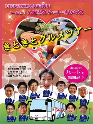 最後に改めてにはなりますが、先日から告知させていただいております9月30日(土)開催のアカデミー会員交流事業「きときとグルメツアー」は、きときと感溢れる後期新入会員が、盛りだくさんの内容でおもてなしさせていただきますので、皆さま乞うご期待ください。