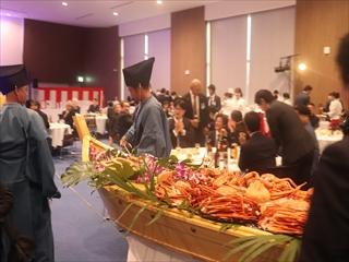 懇親会は式典会場から歩いて3分、今年4月にオープンしたばかりの中滑川複合施設「メリカ」の3F大ホールにて開催され、190名ほどの参加者がいました。『滑川を堪能していただきたい』をコンセプトに組み立てられたお料理、ステージコンテンツが行われ、その中でも巨大な舟型の器に盛られた大量のカニの登場は実に豪快で贅沢でした。また、豪華さだけでなく、地元高校生が開発した『クラフトコーラ』、地元飲食店が開発した『ジビエバーガー』、地元高校生が開発した『サバの缶詰』の振る舞いなど、地域(まち)や官民の連携が見える点があり”さすがまちづくりを担う団体ならでは! と感じる設えでした。お料理も設えも盛りだくさんで、参加者はもとより来賓の皆さまも笑顔で、写真撮影している自分も楽しくなってしまいました。式典で西山理事長が仰られた通り『少人数でもできることがある』というお言葉を見事に体現しておられました。他青年会議所の事業に参加させていただき、見習う点、学ぶ点、素晴らしい体験ができ、やはり『参加が全てのはじまり』であると改めて実感いたしました。