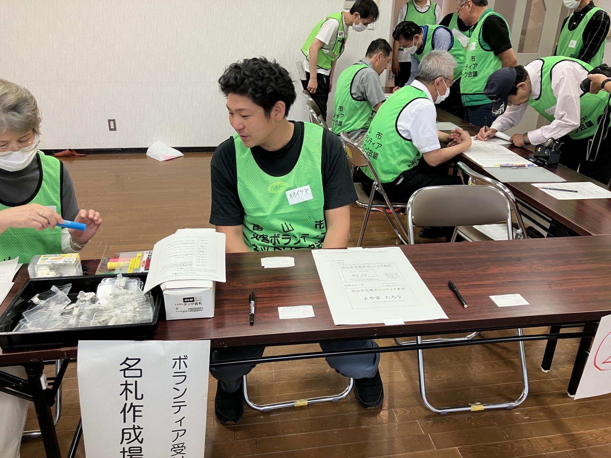内容は、ボランティア活動そのものの訓練ではなく「富山市災害ボランティア本部設置・運営訓練」ということで、ボランティアを「運営する側」の業務を勉強する会でした。私たちは受付業務の訓練を担当させていただきましたが、その役割はボランティアに来ていただいた方の受付を済ませ、各人の連絡先や保有資格を聞いたり、シールで簡易名札を作っていただいたりするものでした。ある意味目立たない業務なのですが、実際にやってみないとその業務の必要性がわからないので、災害が発生してからではなく、予め練習・経験しておくことが重要であると、参加してみてわかりました。