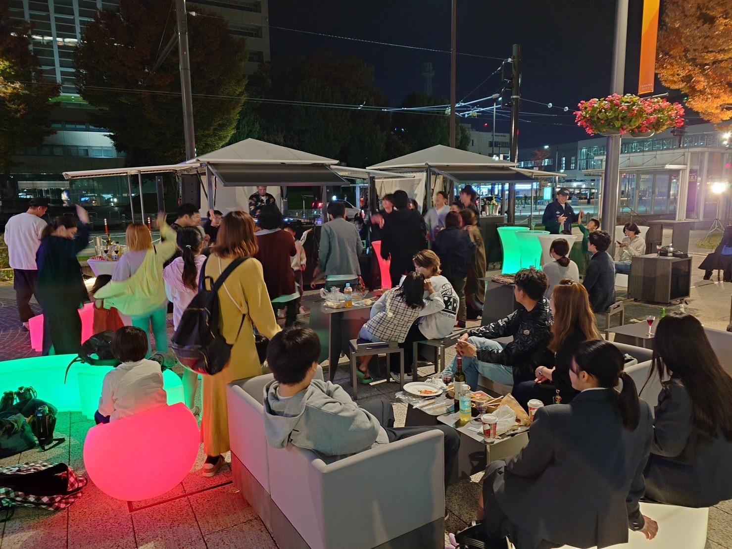 富山駅北ブールバールでは、これまでにないおしゃれな飲食空間をめざし、出店者、メニューDJにまでこだわりました。11月4日(土)の夜には市民が自然発生的にブールバールに集い、心地よい音楽と粋な食べ物、飲み物で盛り上がり、新たなまちなかの活用策をお示しできたのではないかと思います。