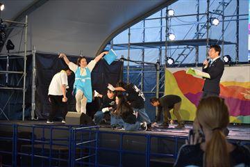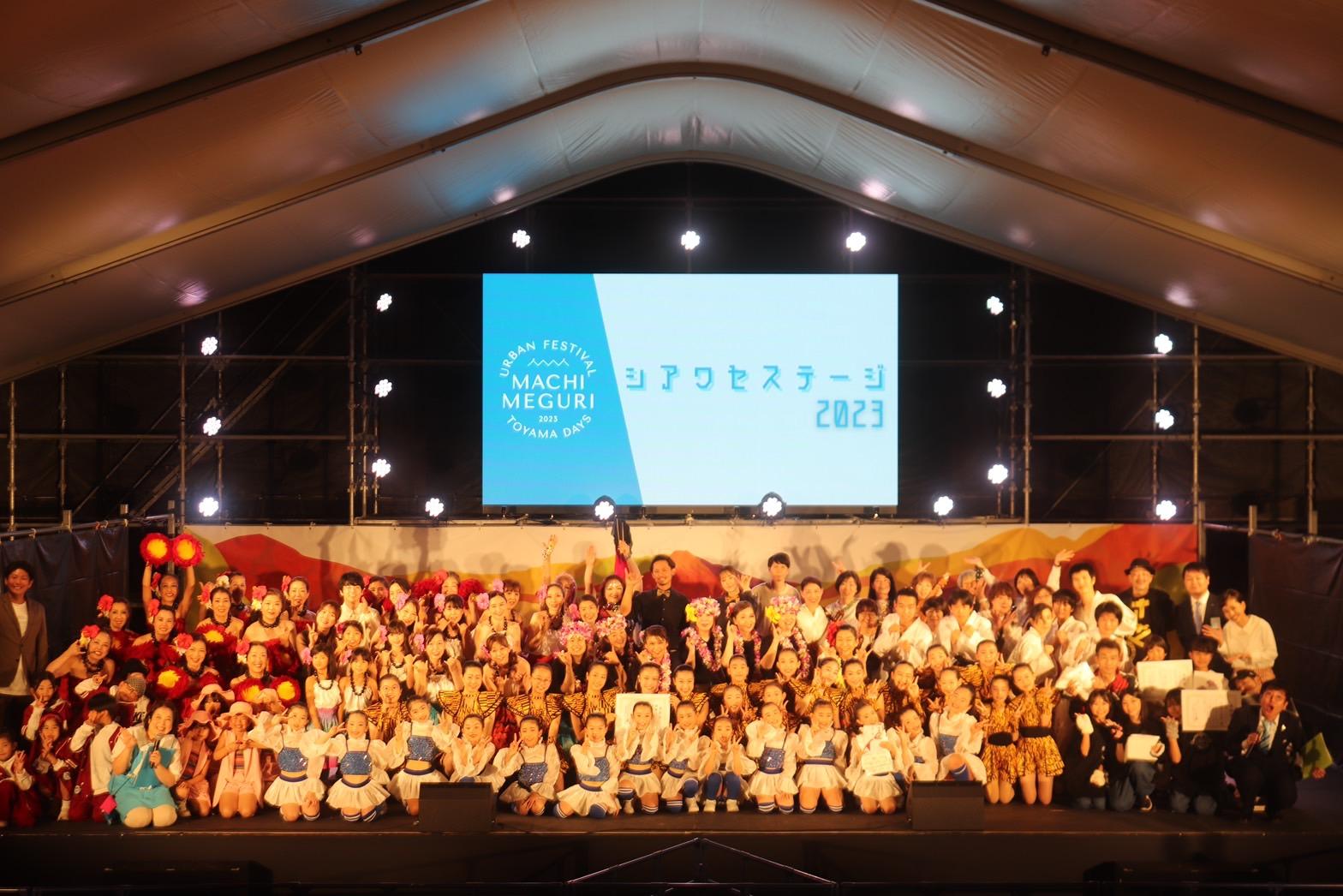 まちめぐり初日。総勢110名を超える出演者の笑顔が途切れることなく続いた、あっという間の2時間半。フィナーレを迎える頃、テントの外に目をやると、夕暮れの空に富山城がひっそり浮かび上がっていました。富山の皆さんとともに創りあげたシアワセステージ2023。ポジティブなエネルギーとあたたかい気持ちを関わったすべての人の胸に残し、大成功にて幕を閉じました。