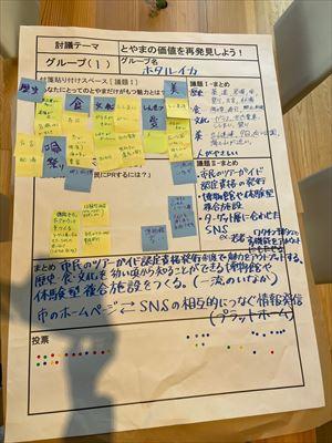 10個のグループに分かれ、「①あなたにとってのとやまだけがもつ魅力とは?」「②とやまの魅力を市民にPRするには?」をアジェンダにディスカッションしていただいたところ、市民の皆さまからはたくさんの意見が出ました。私がファシリテーターを務めさせていただいた10班では、「とやまの魅力PRのためには、まずは自分たちがとやまに自身をもつことが大事だ」という意見が出ており、私自身も気づいていなかったとやまがもつ魅力やPRに向けた考え方など、改めて認識することができました。ディスカッション後には、各グループからの発表と良かったと思う発表への投票を行い、支持を得たグループが決まりましたが、どのグループの発表も素晴らしいものでした!