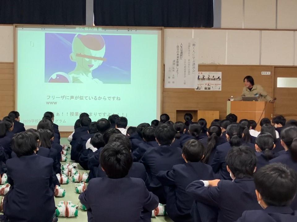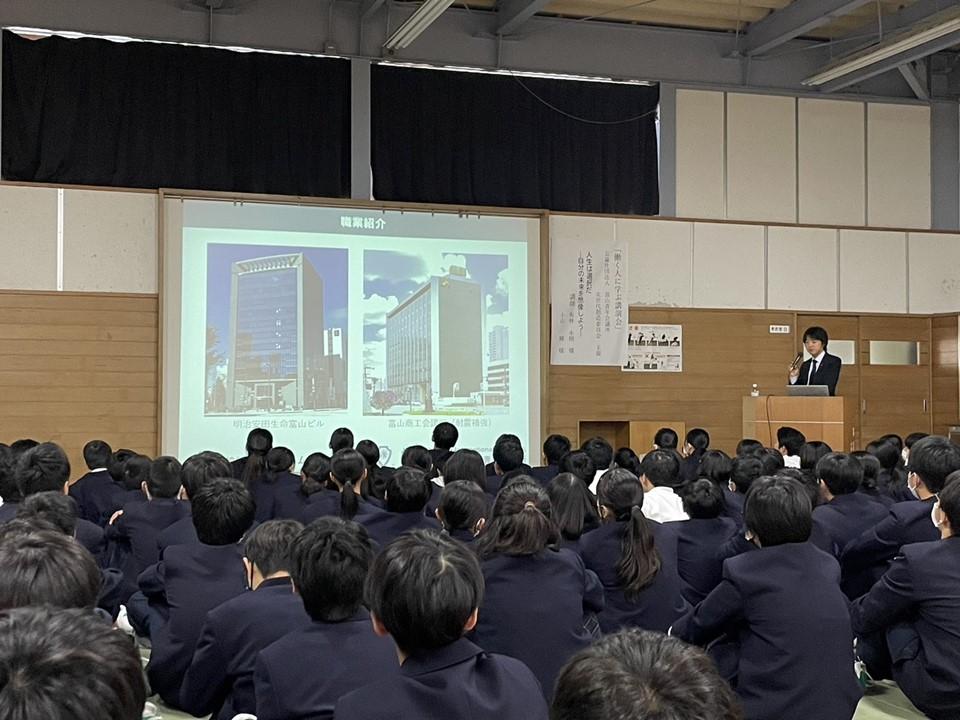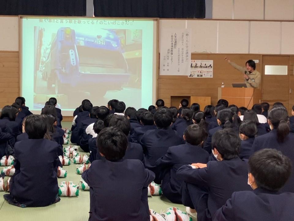 準備期間について、パワーポイントを作成し、何度も修正を重ねて発表の練習に臨んでいた頃は、とても苦労に感じていました。しかしせっかく掴んだ機会、これを中途半端にしてはバチが当たると自分に言い聞かせ、本番当日の早朝までパワーポイントの修正をしていました。発表練習で大人にはウケていたネタも中学1年生には通じなかったりと、決して満点と言える結果ではありませんでしたが、自分自身の経験としては大変有意義なものとなりました。また、本年度は「仕事と選択」がテーマであり、自分が今の職業に就くまでに経験してきた「人生の選択」が話の軸となるのですが、作り上げる過程で自分自身の得意or不得意なこと、好きor嫌いなことや性格なども含めて、改めて自分自身と向き合う時間にもなりました。
