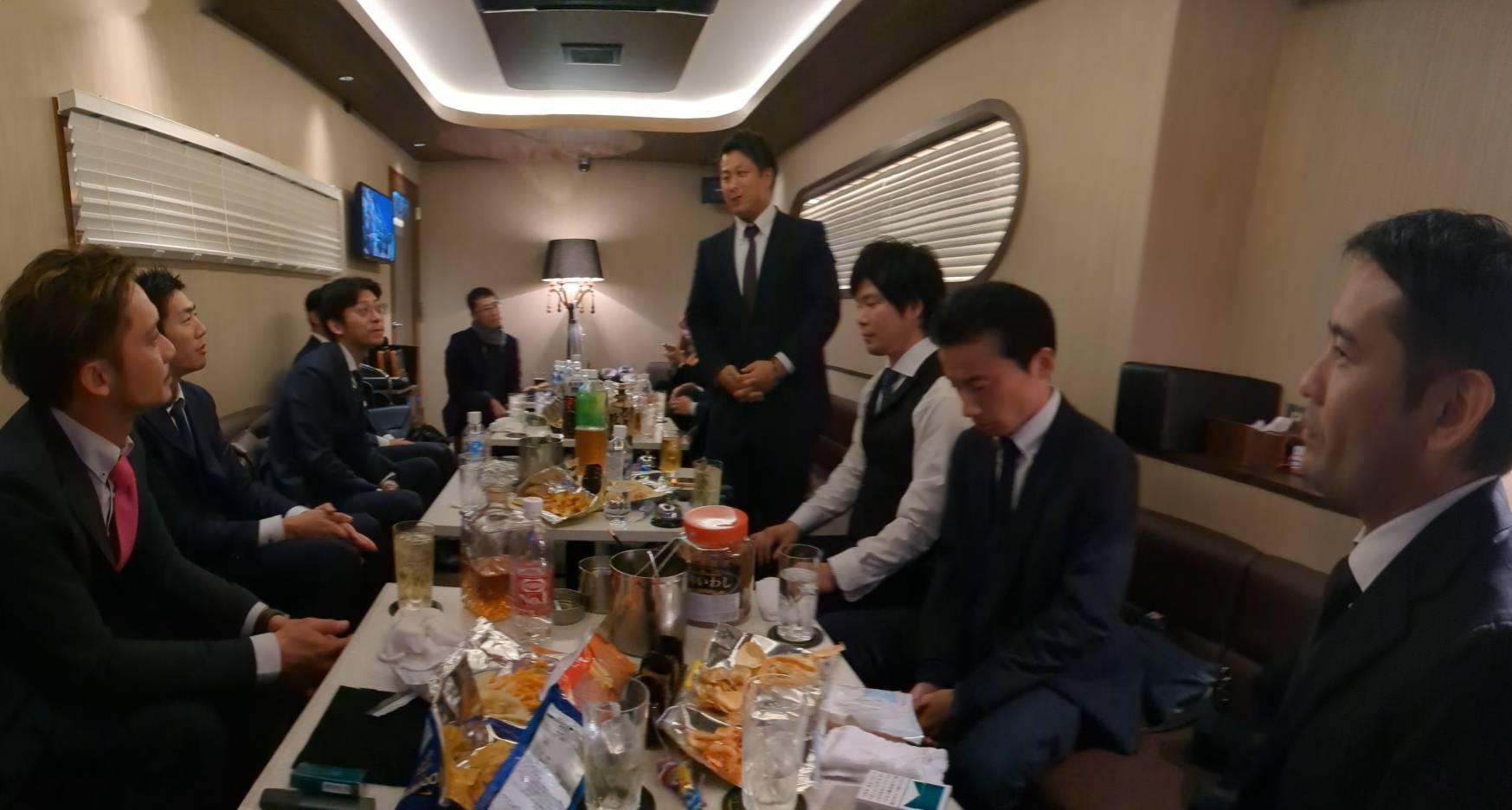 2軒目ではピアノの演奏やカラオケなども皆で楽しみました。総務の盛り上げ隊長こと、えび(江守委員)&いか(平野委員)のコンビを中心に歌い始めると、総務の頭脳であるトッキーこと河合委員もダンスを披露し、卒業生を中心に総務委員会一同も大いに盛り上がり、無事に卒業生をお見送りして帰路につきました。翌日は松原監事への贈答品のお届けを行いましたが、土地幹事、河合委員、平委員も駆けつけてくれました!