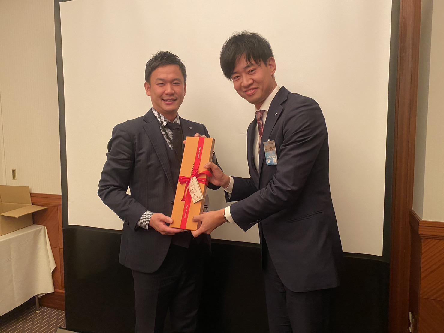 続いて、マラソンゲームの発表です。3位は同率で、マスプリ(関野 伸也君)、ハーモニー(田島 康平君)、ハム(岩木 公平君)、2位はコブ(林 紘平君)、そして僭越ながら1位は私、トッポでございました。それぞれ豪華景品をいただきました。私に至っては、纏っているスーツよりも高いであろう、ハイブランドのネクタイをいただきました。松原委員長本当にありがとうございます。こちらのネクタイ着用の際は、染み防止のため、ラーメンや油物は控えさせていただき、大切に使います!