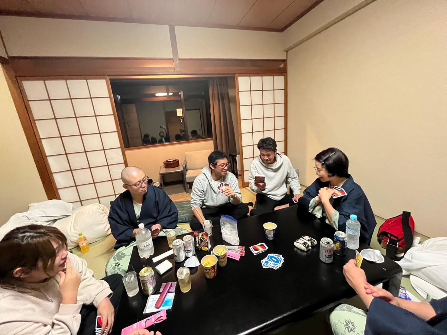 部屋で開催された二次会ではUNO(チャッキーさん持参)を行いました。おじさんは参加せず別の部屋で寝てしまいました。21後期は集まるとUNOをする傾向があります。