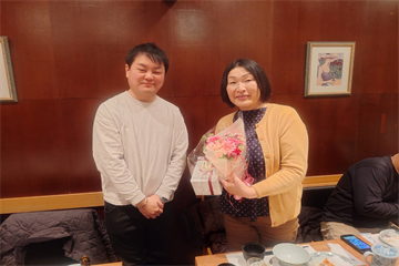 掃除の後は、酒井さんと参加者でランチ会を開催しました。事務局で色々お世話になった酒井さんへ、1年間の感謝の思いを込めて、理事長より花束とプレゼントをお渡ししました。